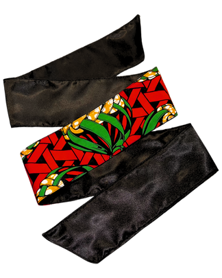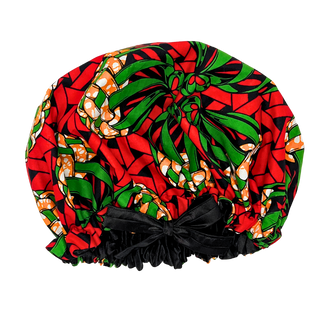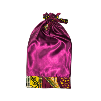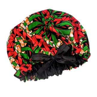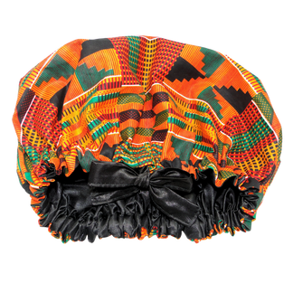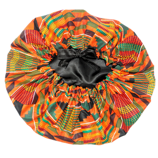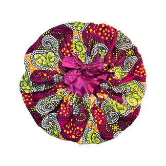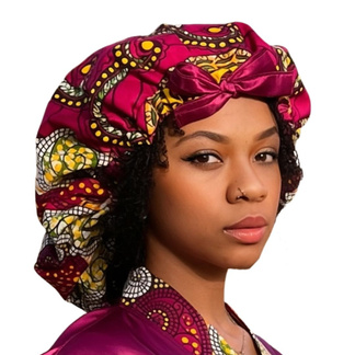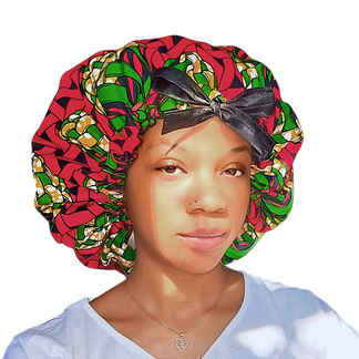 Satin-lined bonnet with adjustable satin ribbon. Vibrant African print cotton exterior. Handmade with love in the USA.