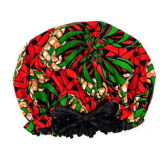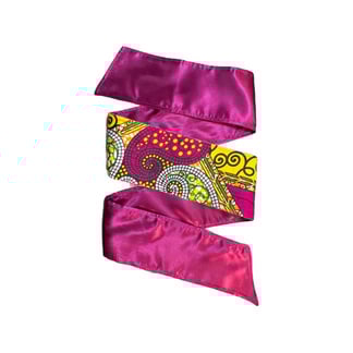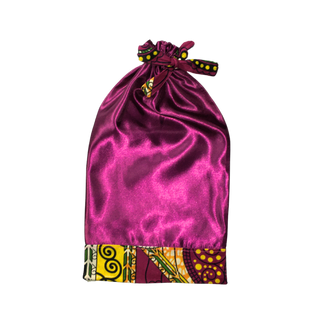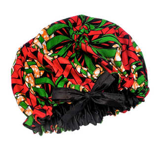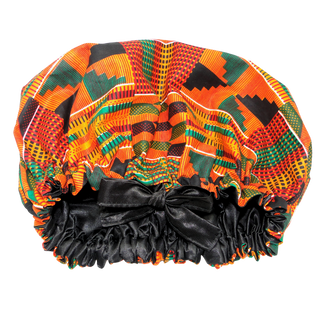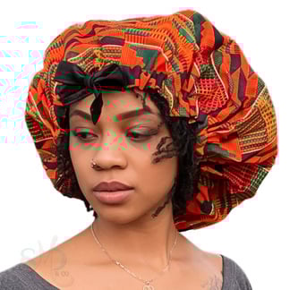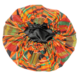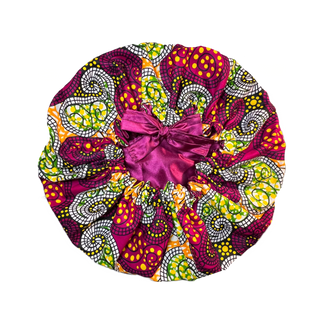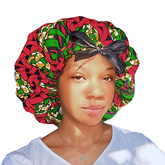 Satin-lined bonnet with adjustable satin ribbon. Vibrant African print cotton exterior. Handmade with love in the USA.